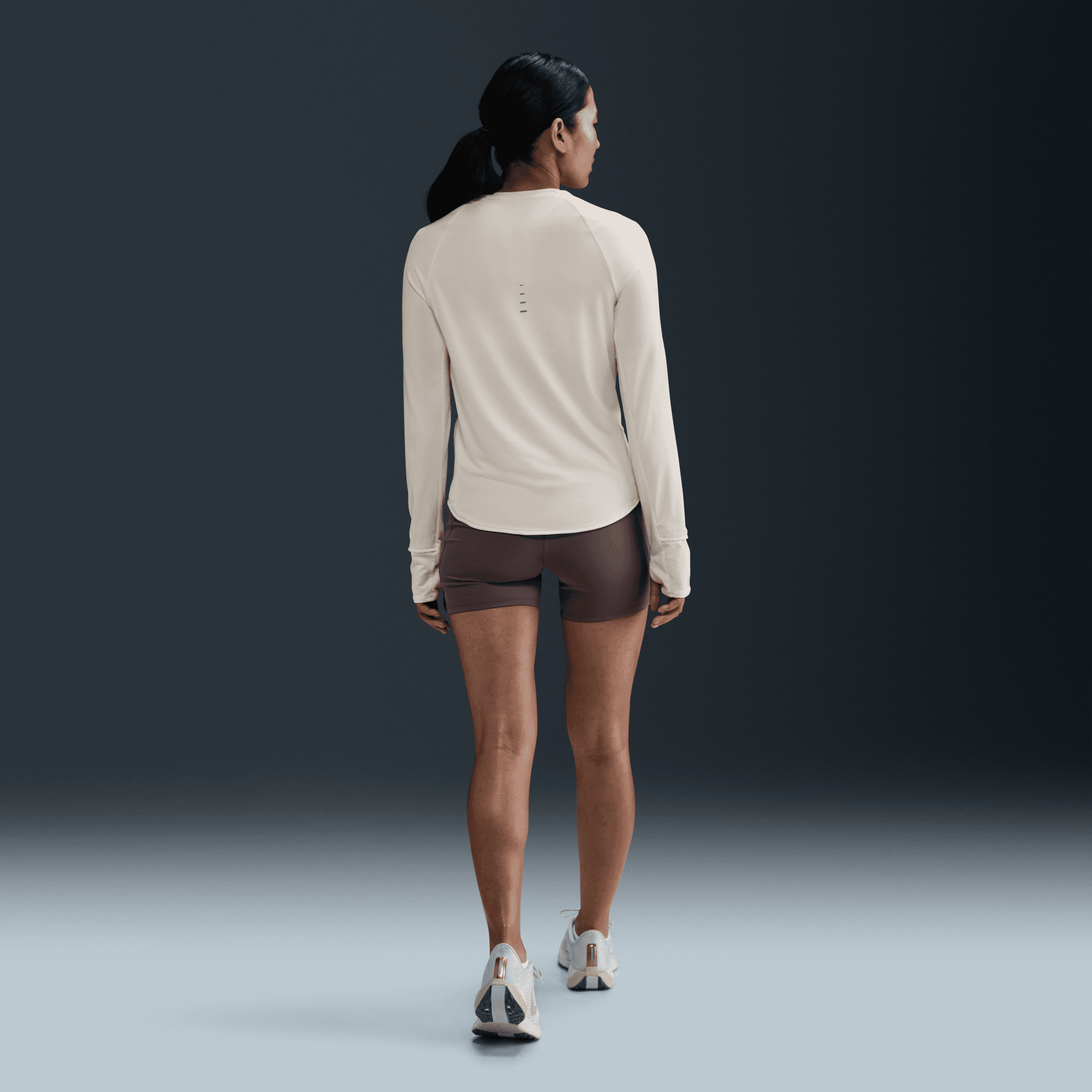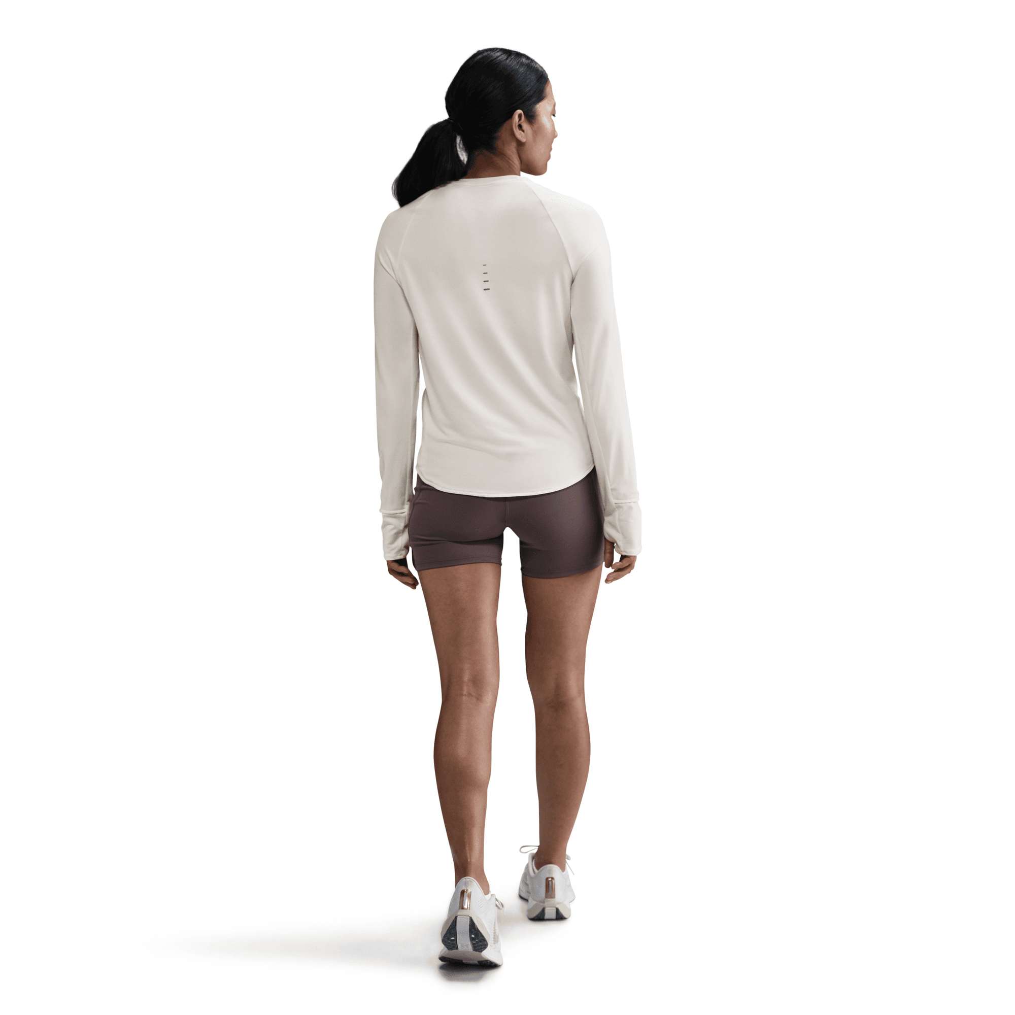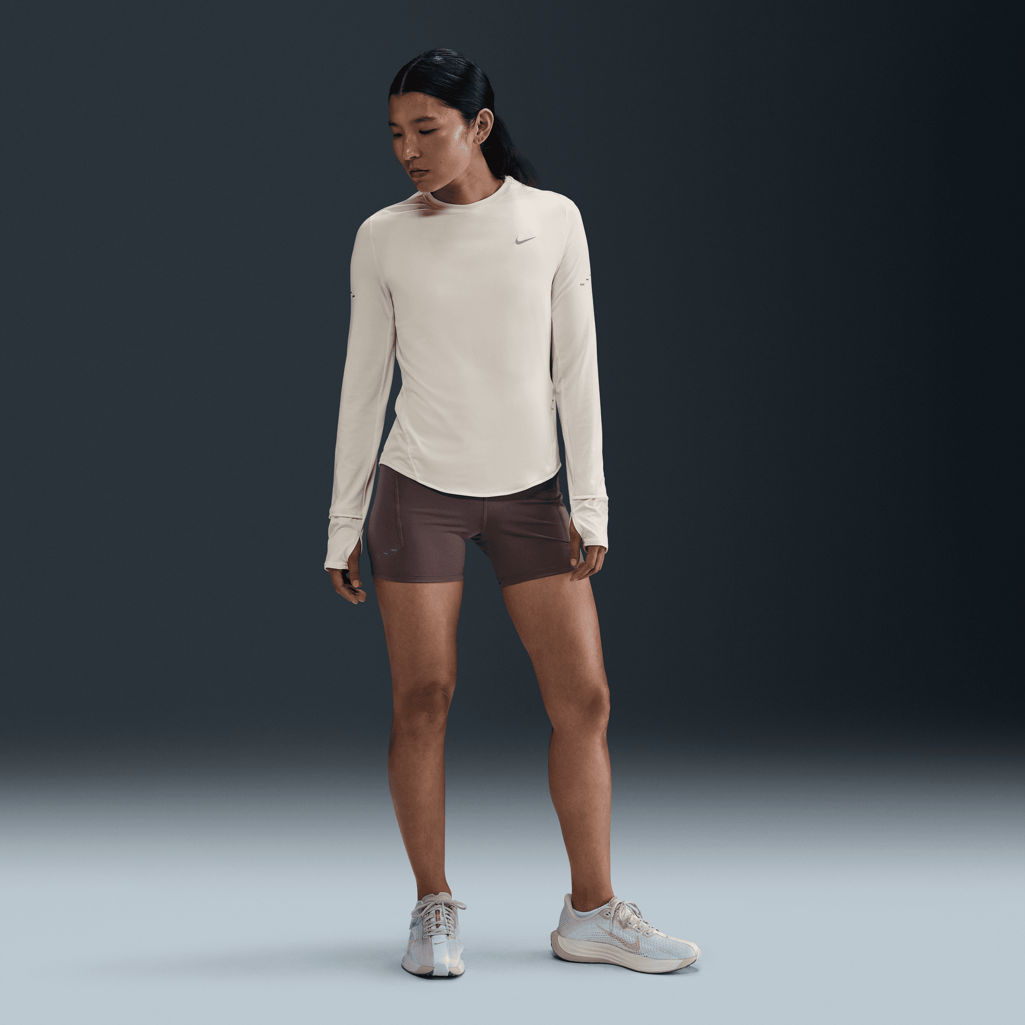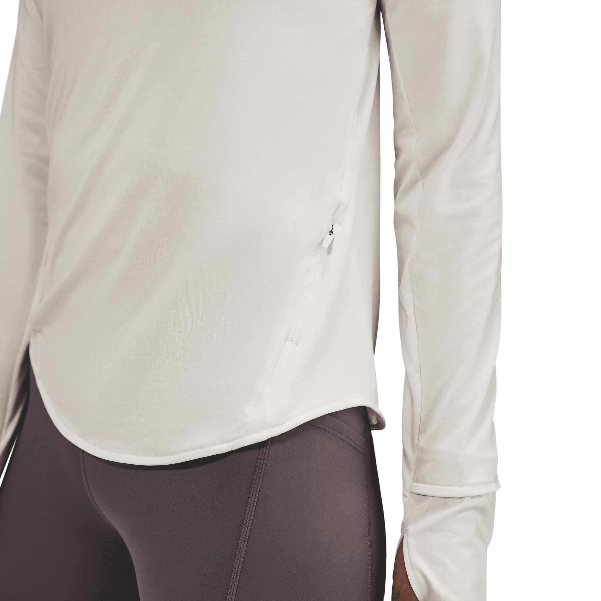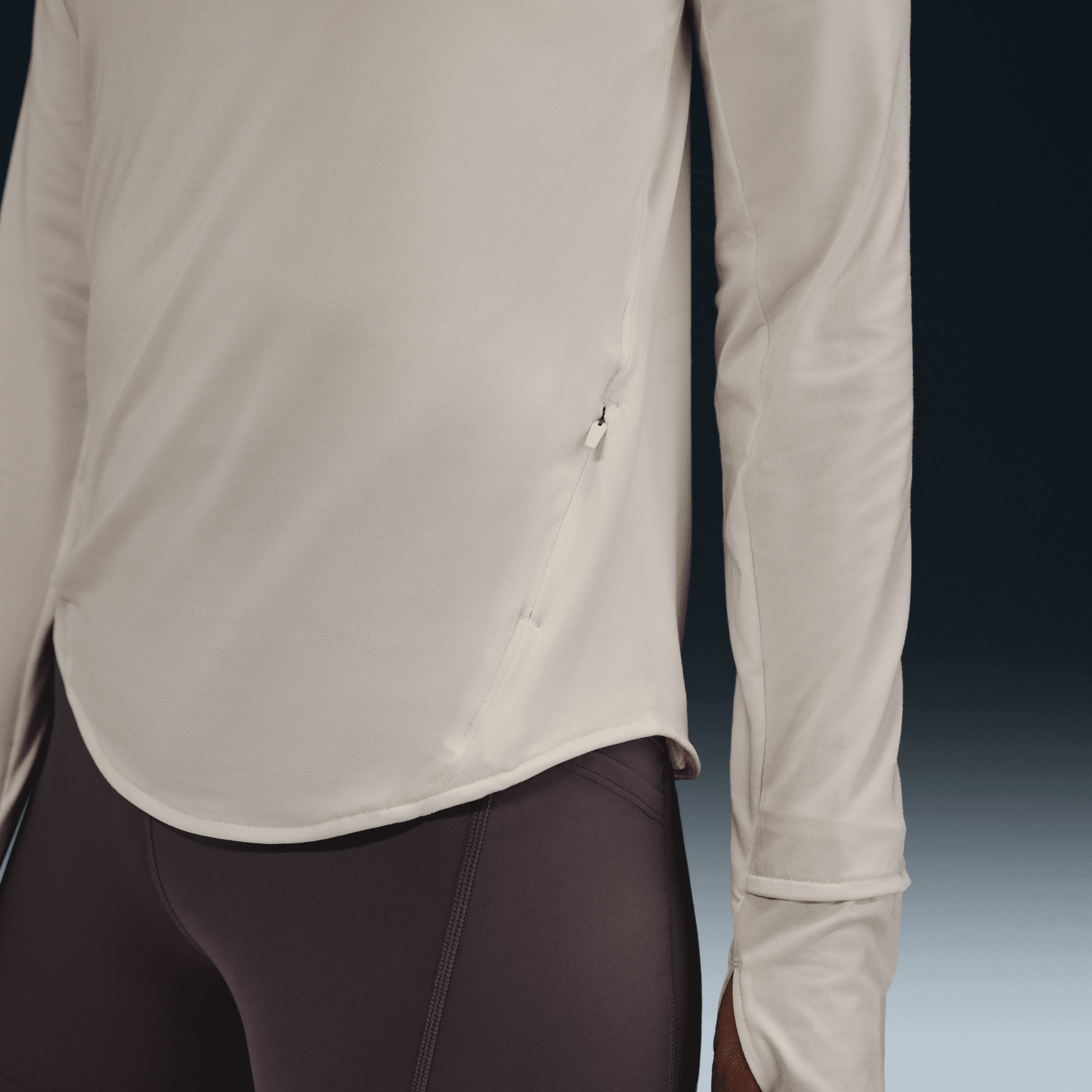 The top is tapered around the waist so that layering with other pieces is easier. A curved hem helps keep you covered through your stride. Plus, thumbholes let you extend your coverage and help hold the sleeves in place.