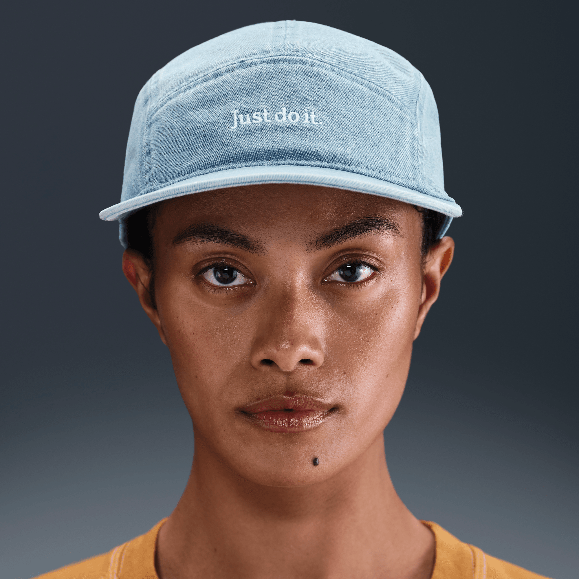 The soft washed denim of this cap is embroidered with a "Just Do It" emblem. Fly caps all have a snug and athletic fit with a low depth.