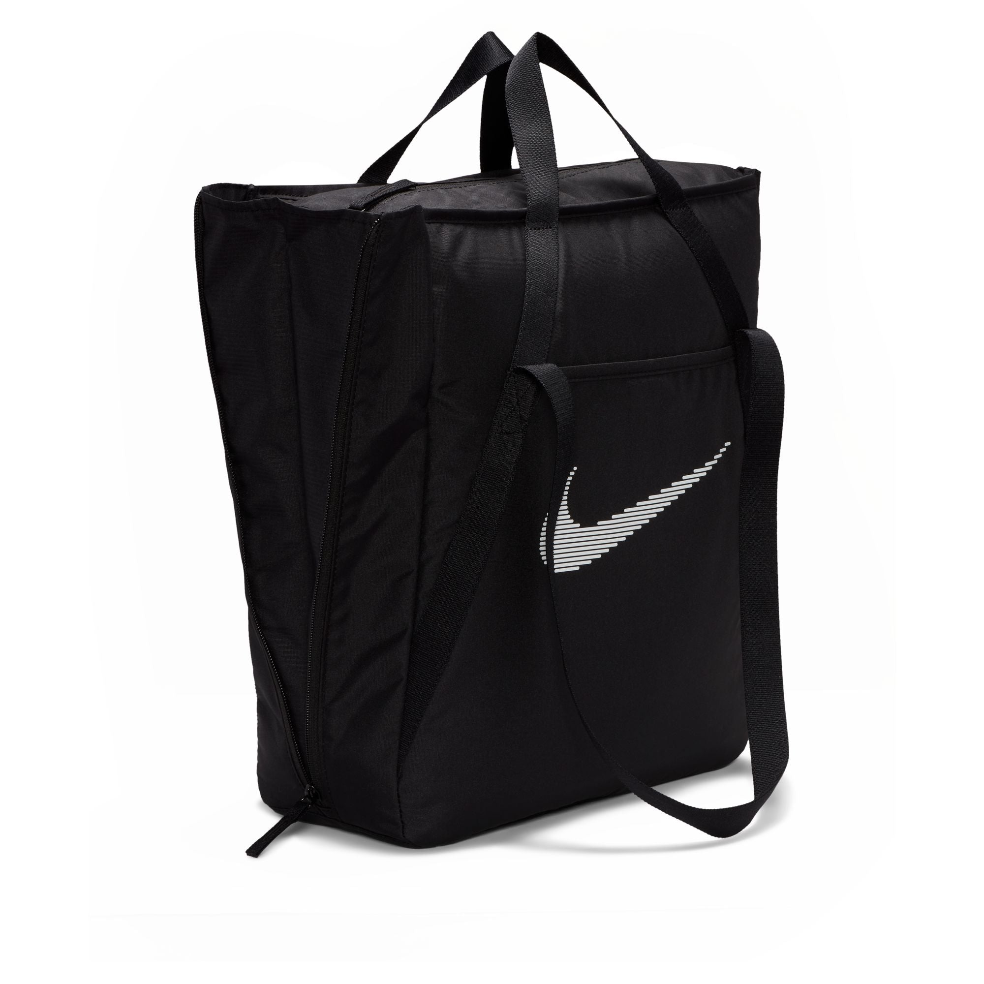 This tote bag is as multidimensional as you are. No matter what your fitness journey is, the Nike Gym Tote is made to handle it. Multiple deep pockets line the inside of this bag, both open and zippered for extra security. The front and back features pockets for the small things you want easy access to. And, the size of this tote is deceptive—the sides feature expanding fabric panels for extra space whenever you need it.