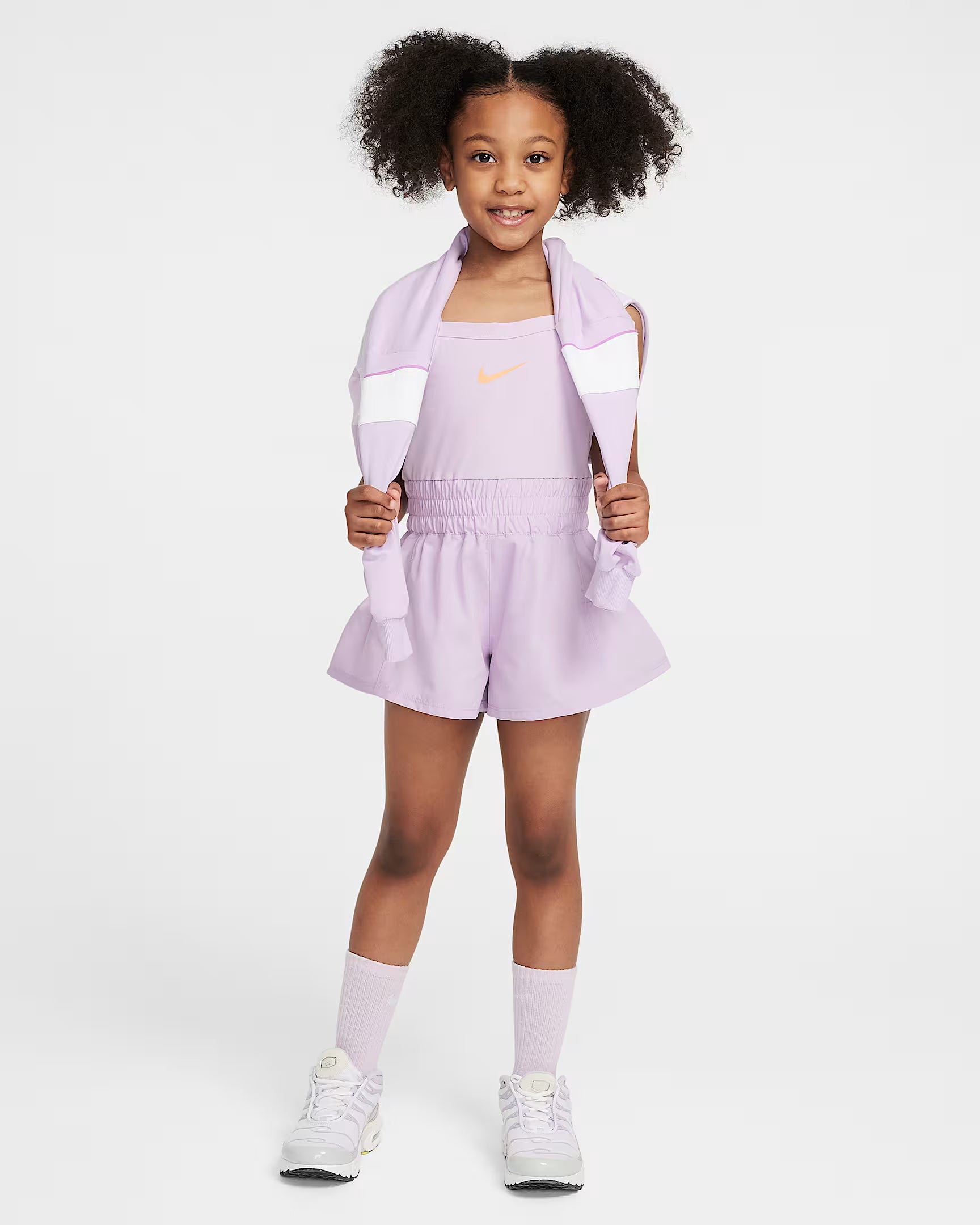 Sunny days call for easy all-in-1 dressing. This romper is made of stretch knit fabric enhanced with quick-drying, moisture-wicking, Dri-FIT technology to help keep little ones cool and dry while they play. It features a comfy stretch waistband and the flouncy shorts have a built-in liner for full coverage and freedom of movement.