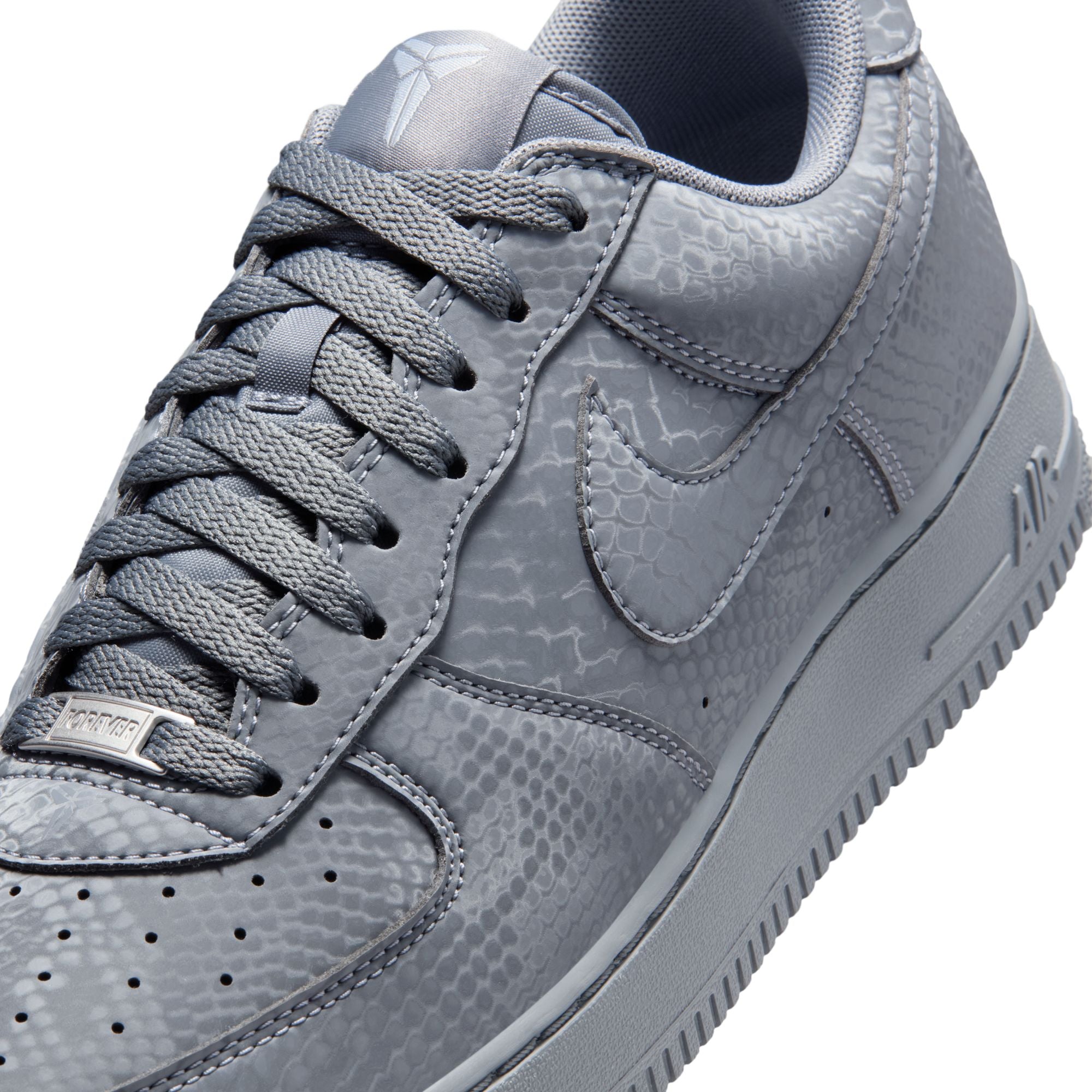This special-edition AF1 is infused with Mamba DNA, like the allover snakeskin print—putting a distinct spin on an all-time classic. The embroidered "8" and "24" on the heel nod to Kobe's retired jersey numbers, while Sheath logos on the tongue and outer heel add signature branding. Complete with special "Mamba Forever" lace dubraes, this Kobe AF1 continues the legacy.