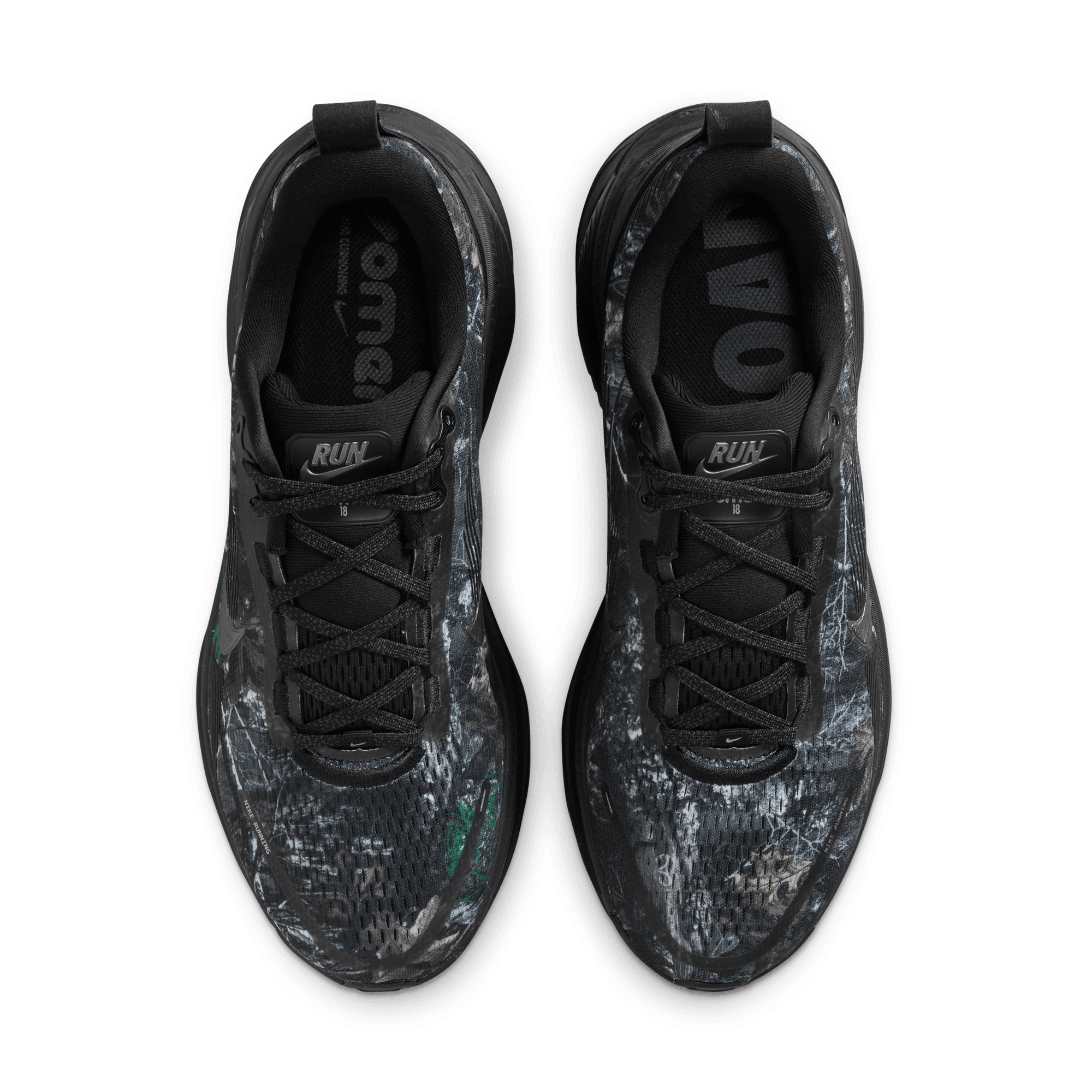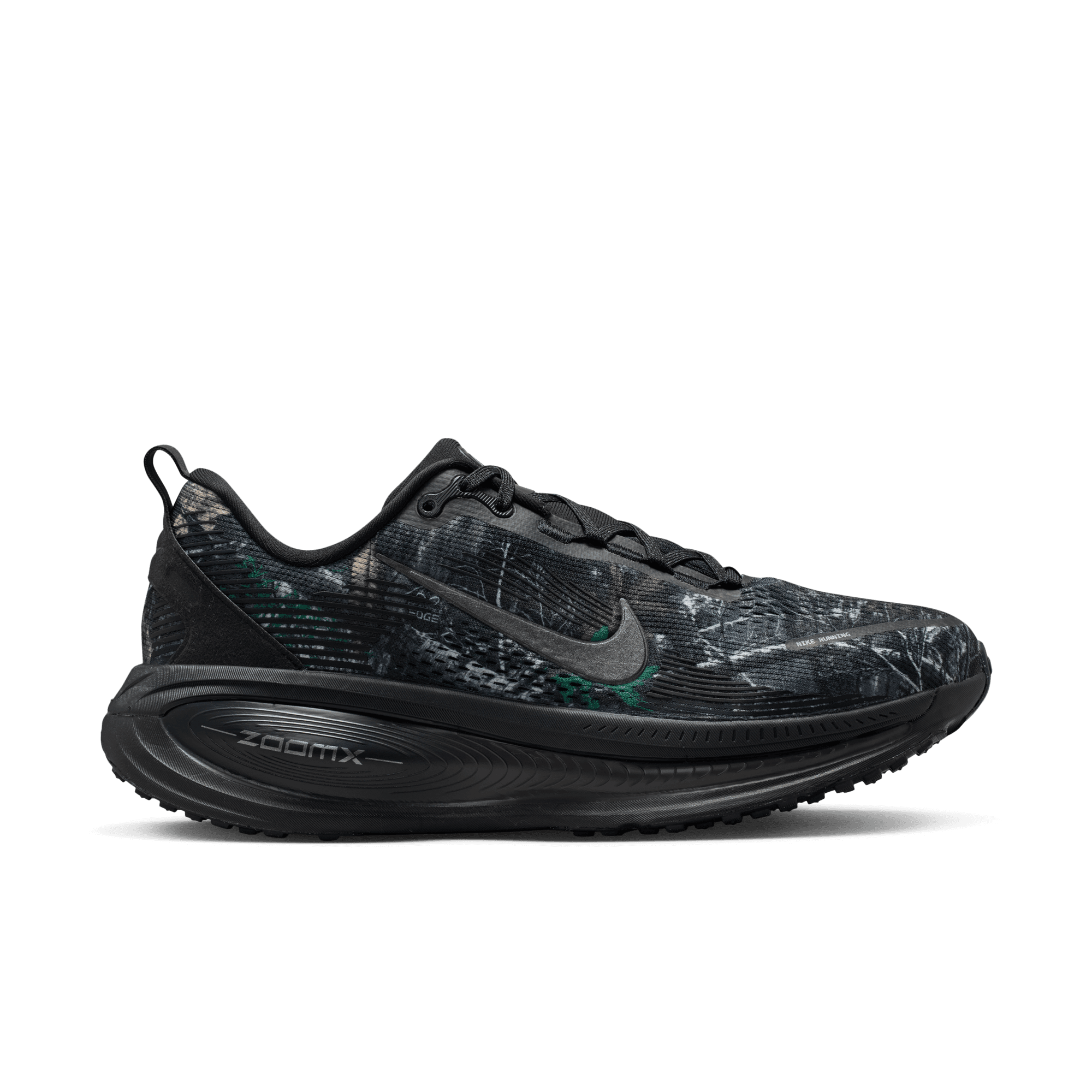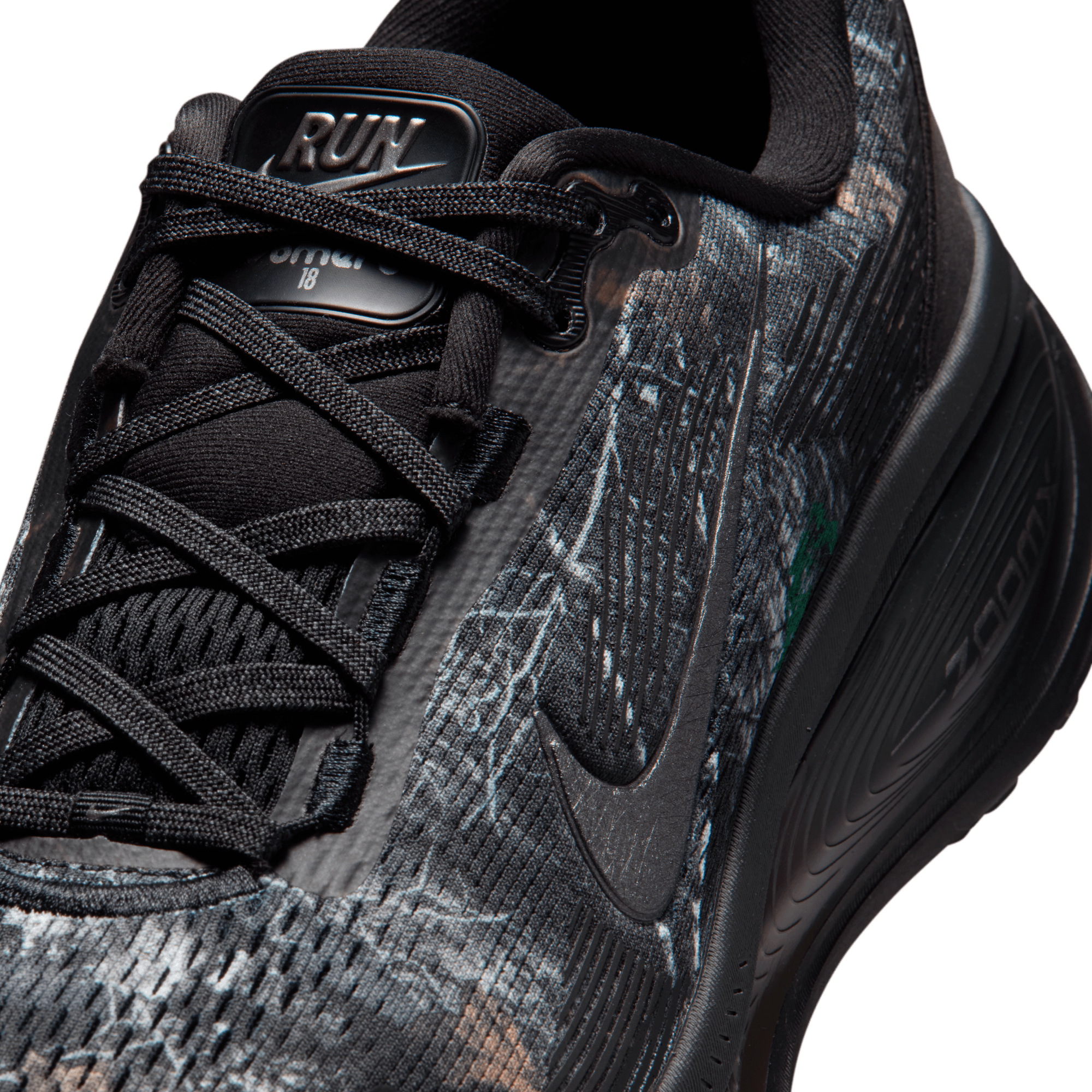 Maximum cushioning in the Vomero 18 provides a comfortable ride for everyday runs. Our soft, cushioned ride has lightweight ZoomX foam stacked on top of responsive ReactX foam in the midsole. Plus, the mesh upper is elevated with a Realtree® camo graphic and a redesigned traction pattern on the outsole offers a smooth heel-to-toe transition.