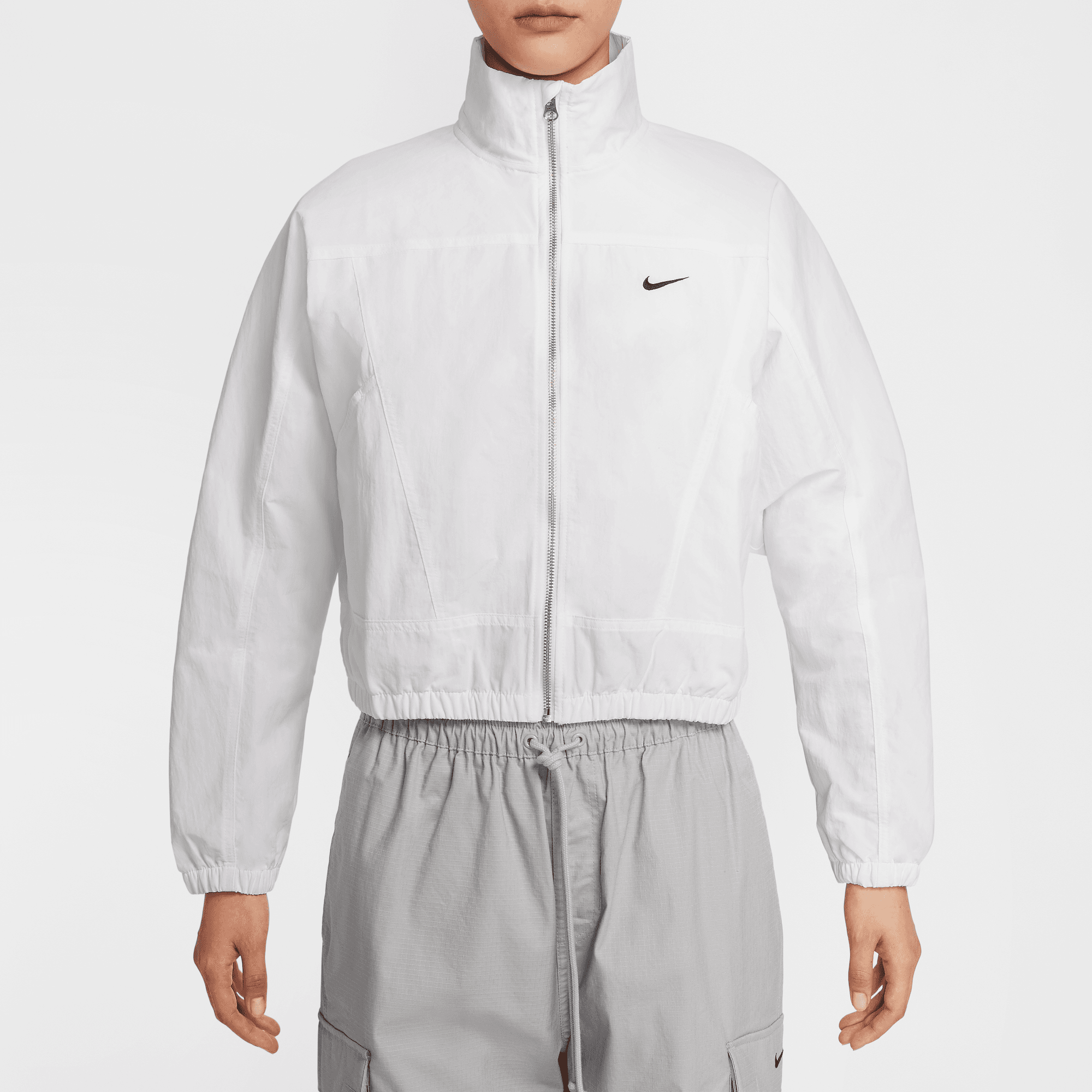 Simplicity and functionality come together in this lightweight jacket. Textured, water-repellent nylon and an elongated collar help keep you covered come rain or shine. Angled seams and a cropped length add dimension to the oversized fit.