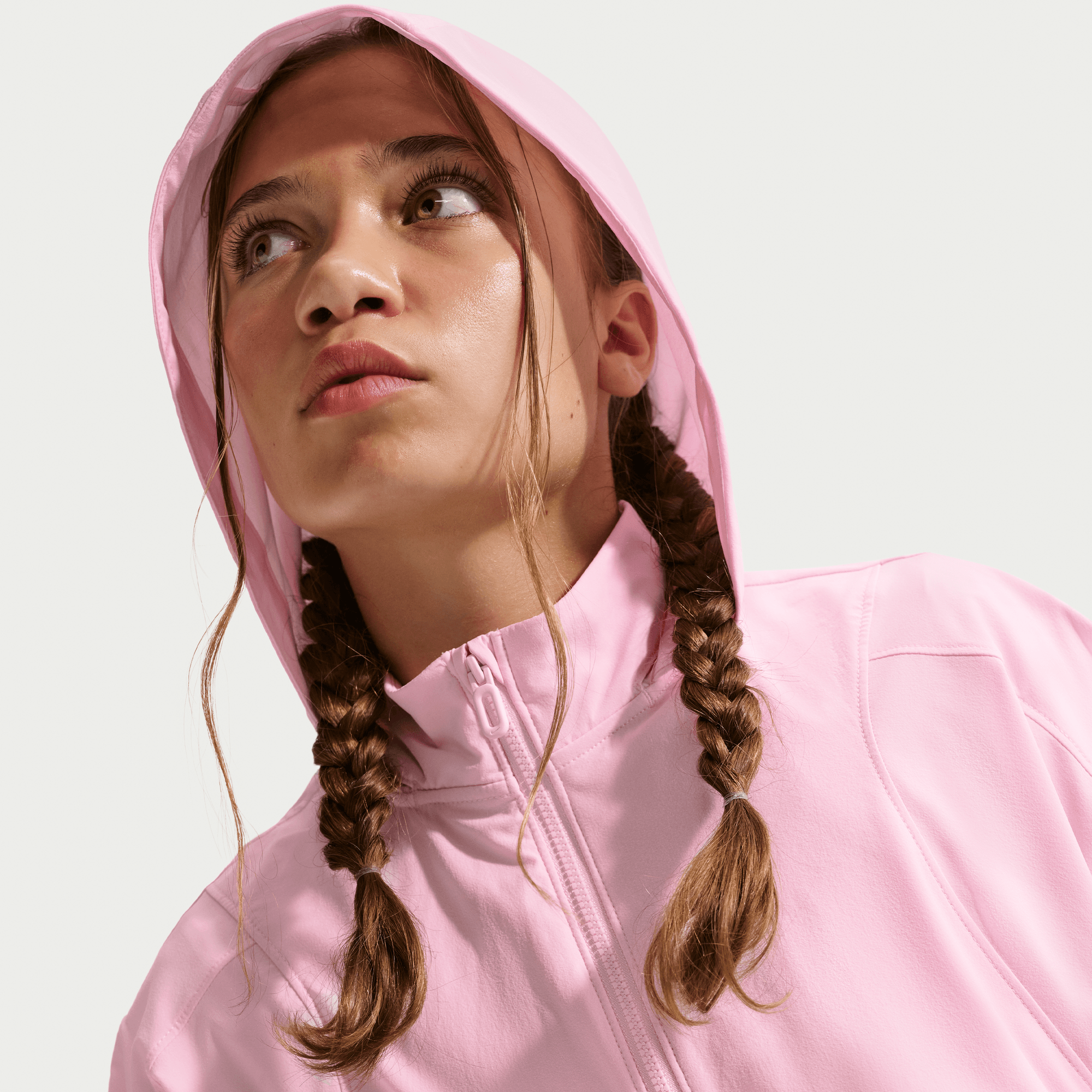 Ready for anything, this jacket is made to keep you cozy all day. Its lightweight and smooth woven fabric repels rain and UV rays, and a packable hood gives you the option for more coverage.