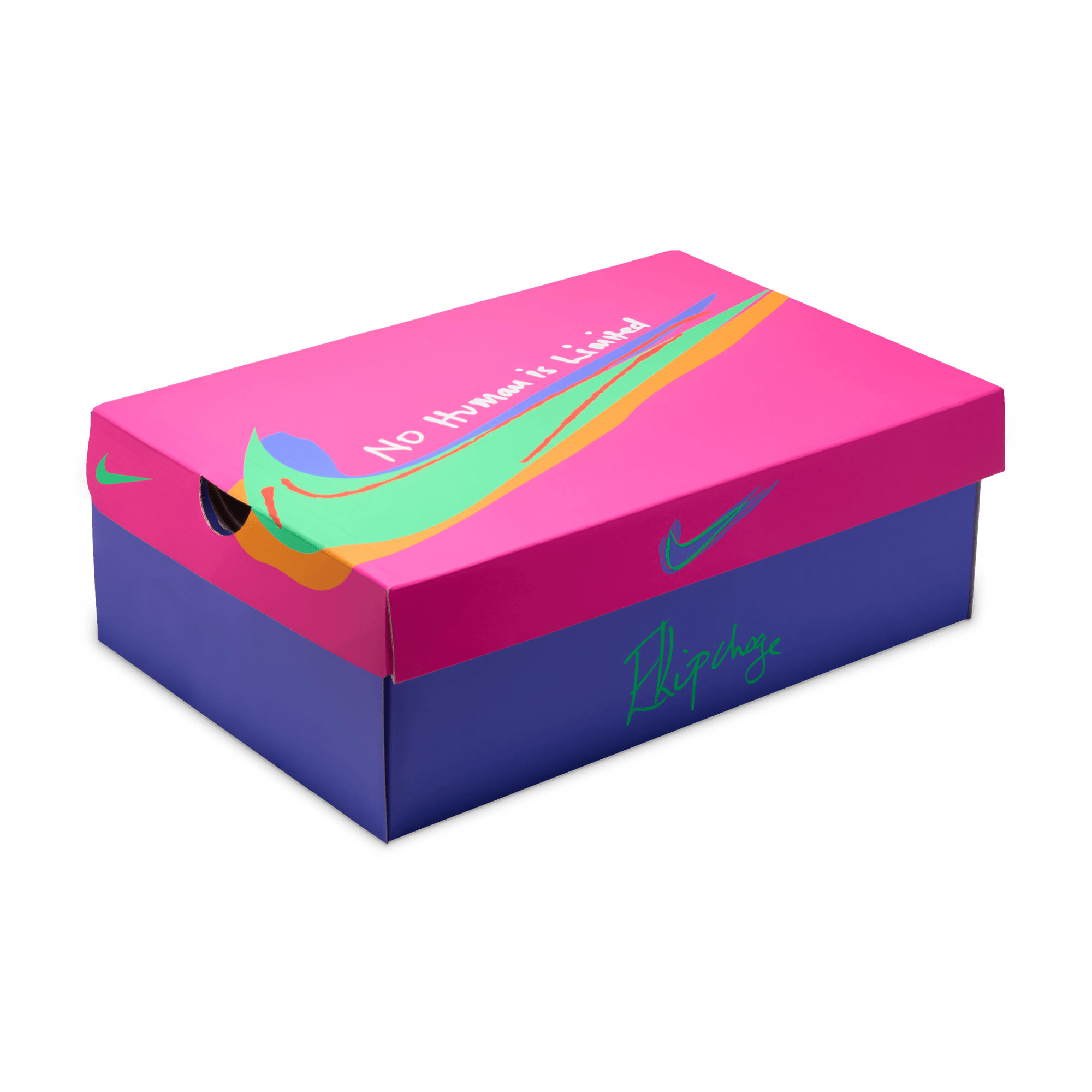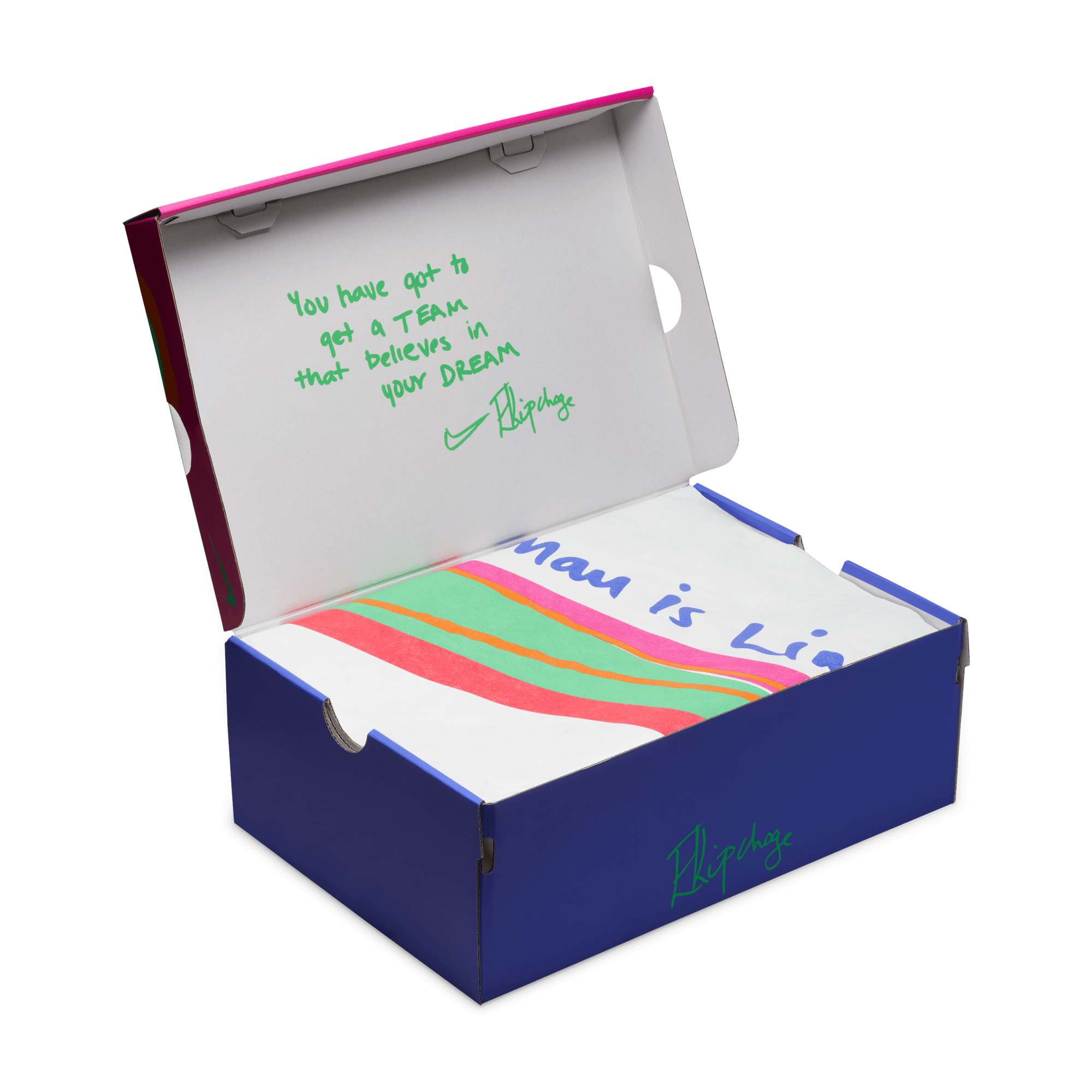 Whenever someone trains with Eliud Kipchoge, they're asked to plant a tree at his base camp to signify their growth. The sockliner graphics mimic that growth with branches moving forward towards the front of the shoe. The red clay color fade nods to the Kenyan dirt that stains the shoes when training. The font is a play on African trees that have fractal-like patterns on the surfaces.